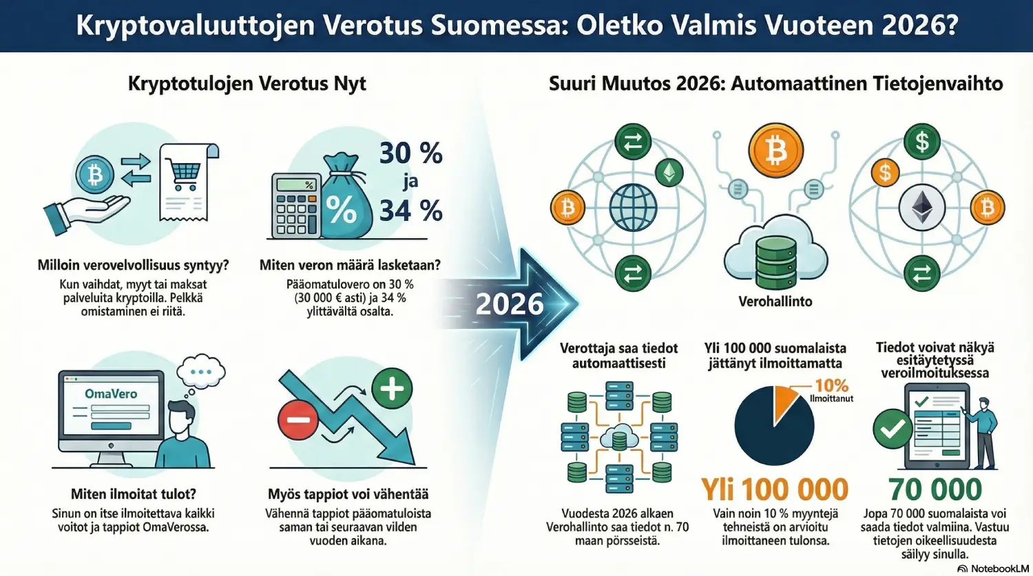 Vastuu kryptotulojen ilmoittamisesta on aina sinulla itselläsi. Tiedot eivät siirry automaattisesti pörsseistä Verohallinnolle, vaikkakin kansainvälinen tietojenvaihto tehostuu jatkuvasti. Vuodesta 2026 alkaen Verohallinto alkaa saada kattavammin tietoja kryptovarojen kaupankäynnistä.