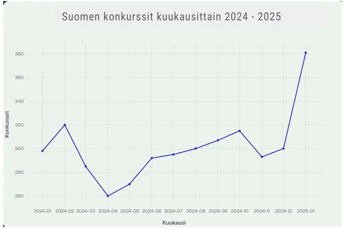 Alkuvuosi 2025 on tuonut poikkeuksellisen huolestuttavia uutisia Suomen yrityskentältä. Konkurssien määrä on noussut korkeimmalle tasolleen vuosikymmeniin, ja erityisesti tammikuu oli synkkä. Raju piikki iski ankarimmin pienyrittäjiin ja toiminimellä toimiviin, joiden konkurssit kasvoivat peräti 2,5-kertaiseksi edellisvuoteen nähden.